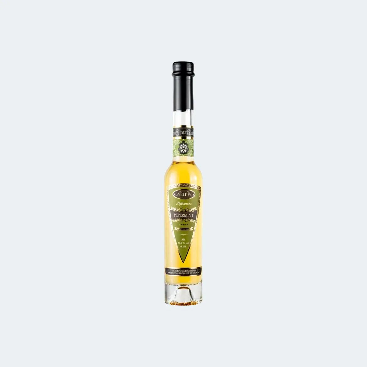 Aura Pepermint Aura Pepermint is the result of mint leaf harvested in Grandma's garden, macerated in fruit brandy, moderately sweetened with honey, evoking memories of past times when tasted.